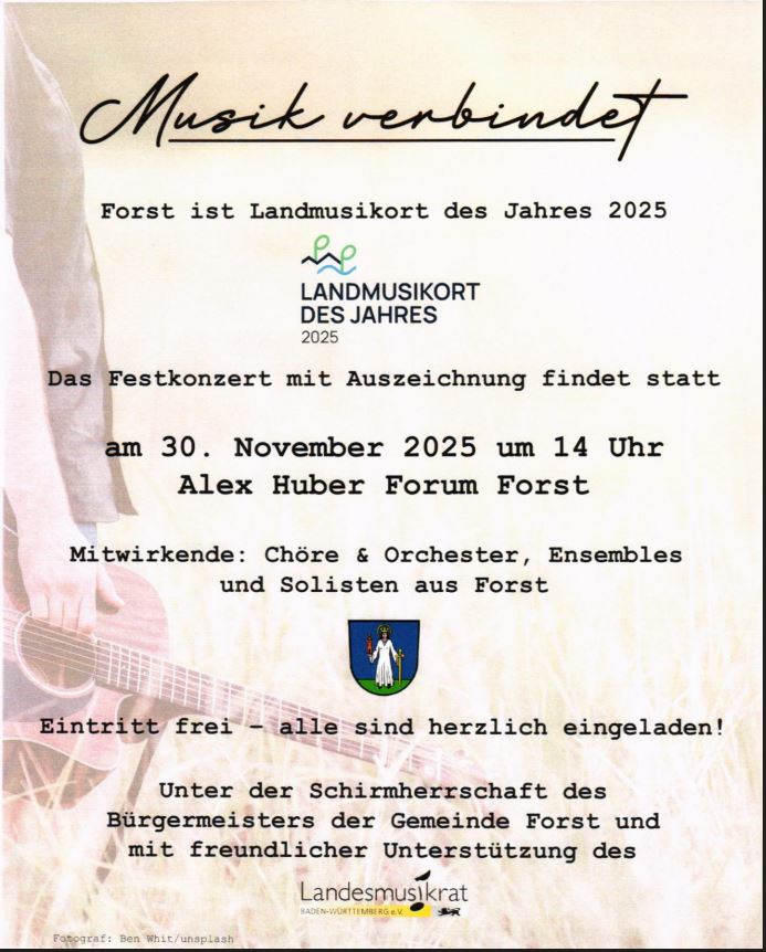 Ein lokales Leuchtturmprojekt der Musikkultur im ländlichen Raum: Der Deutsche Musikrat (DMR) und der Bundesmusikverband Chor & Orchester (BMCO) haben die Gemeinde Forst als Landmusikort 2025 ausgezeichnet. Das Preisgeld beträgt 10.000 Euro. Es soll für Projekte der Amateurmusik oder für die Zusammenarbeit zwischen Profi- und Amateurmusik vor Ort eingesetzt werden. Darüber hinaus soll es neue Initiativen anstoßen, die die musikalischen Strukturen in der jeweiligen Kommune stärken und weiterentwickeln.