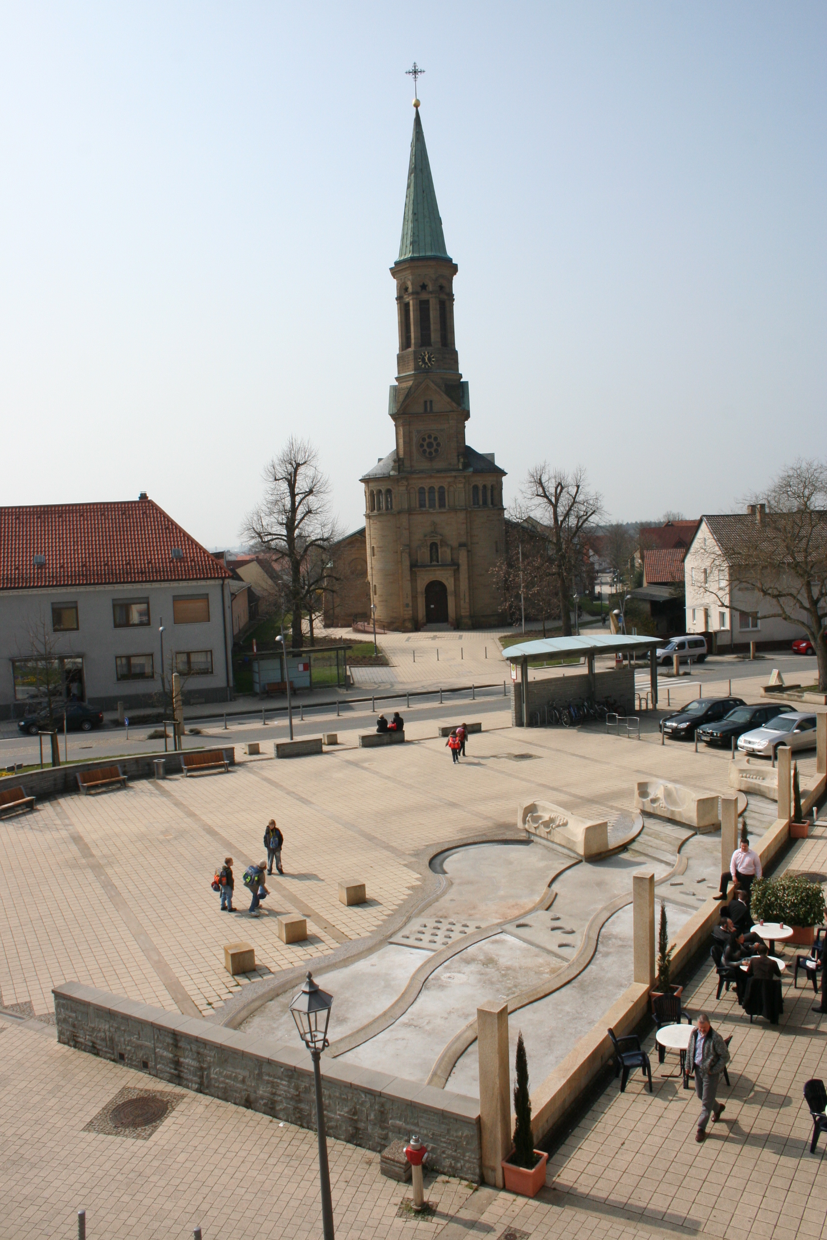 Die Neugestaltung des Kirchplatzes knüpft an die Platz- und Wegegestaltung im Bereich des Seniorenheimes im Kirchengarten an. Das Muster des Plattenbelages wurde aufgegriffen und bis zum Rathausvorplatz weitergeführt. Besonders großzügig wirkt die Ortsmitte nicht zuletzt auch dadurch, dass sich die Katholische Kirchengemeinde entschlossen hat, den Kirchenvorplatz mit in die Gesamtplanung einzubringen. So konnte ein einheitlich gestalteter Platz entstehen, auf dem mittwochs und samstags ein Wochenmarkt stattfindet. Der gesamte Platz ist fast 700 qm groß und mit Sitzbänken, Fahrradständern und Bäumen ausgestattet, ein schon älterer recht großer Baum erinnert an den alten Ortskern.Das Herzstück des Kirchplatzes ist die knapp 100 qm große Wasseranlage. Durch die geringe Wassertiefe zwischen 2 cm und 10 cm stellt der Brunnen auch für Kleinkinder keine Gefahr dar. Die teilweise beweglichen Formen aus Edelstahl leiten das Wasser immer wieder um, geben ihm eine andere Struktur und lassen so wechselweise einen Wellenteppich entstehen. Die dreiteilige große Steinplastik der Forster Künstlerin Ulla Steiner bildet einen zusätzlichen Blickfang.